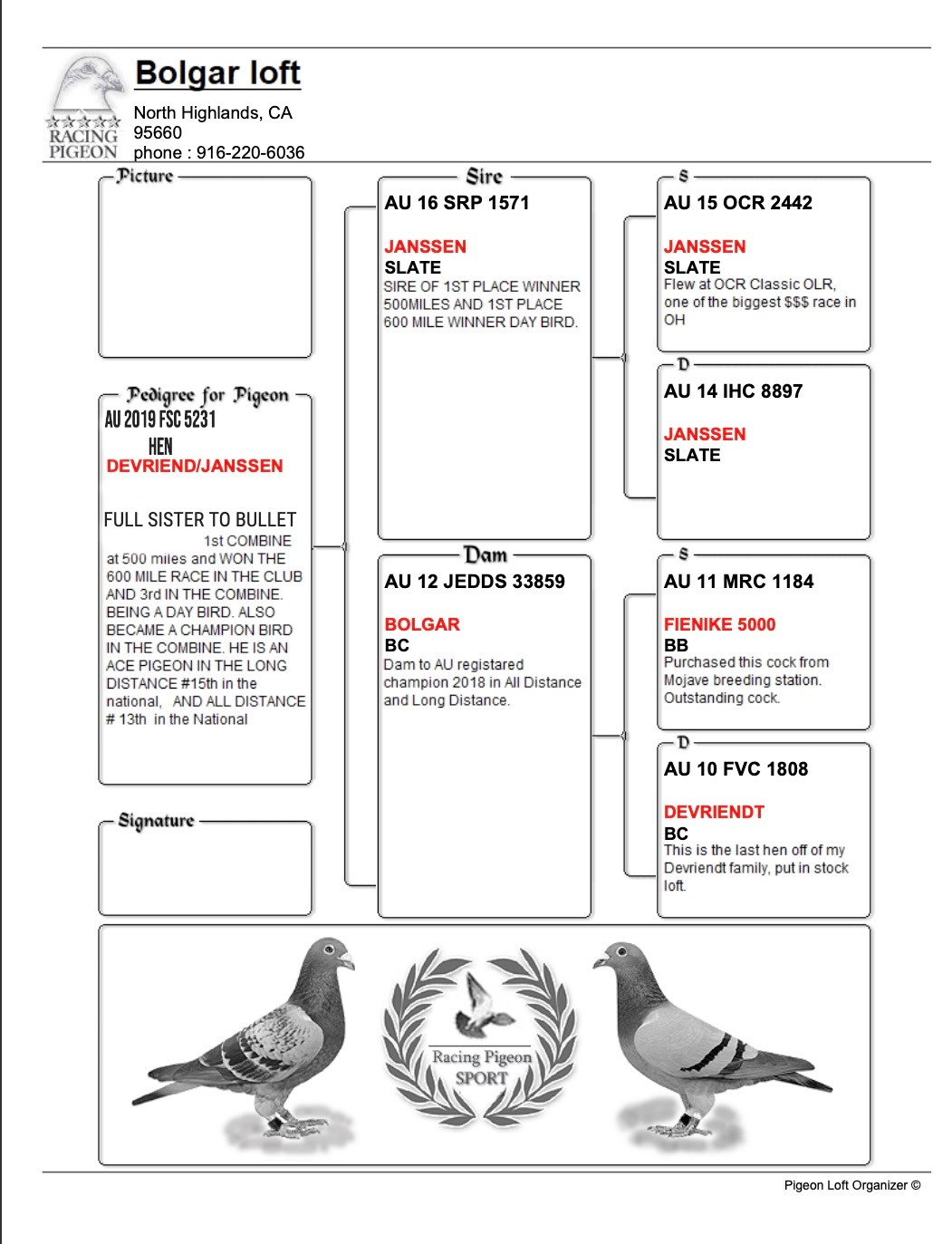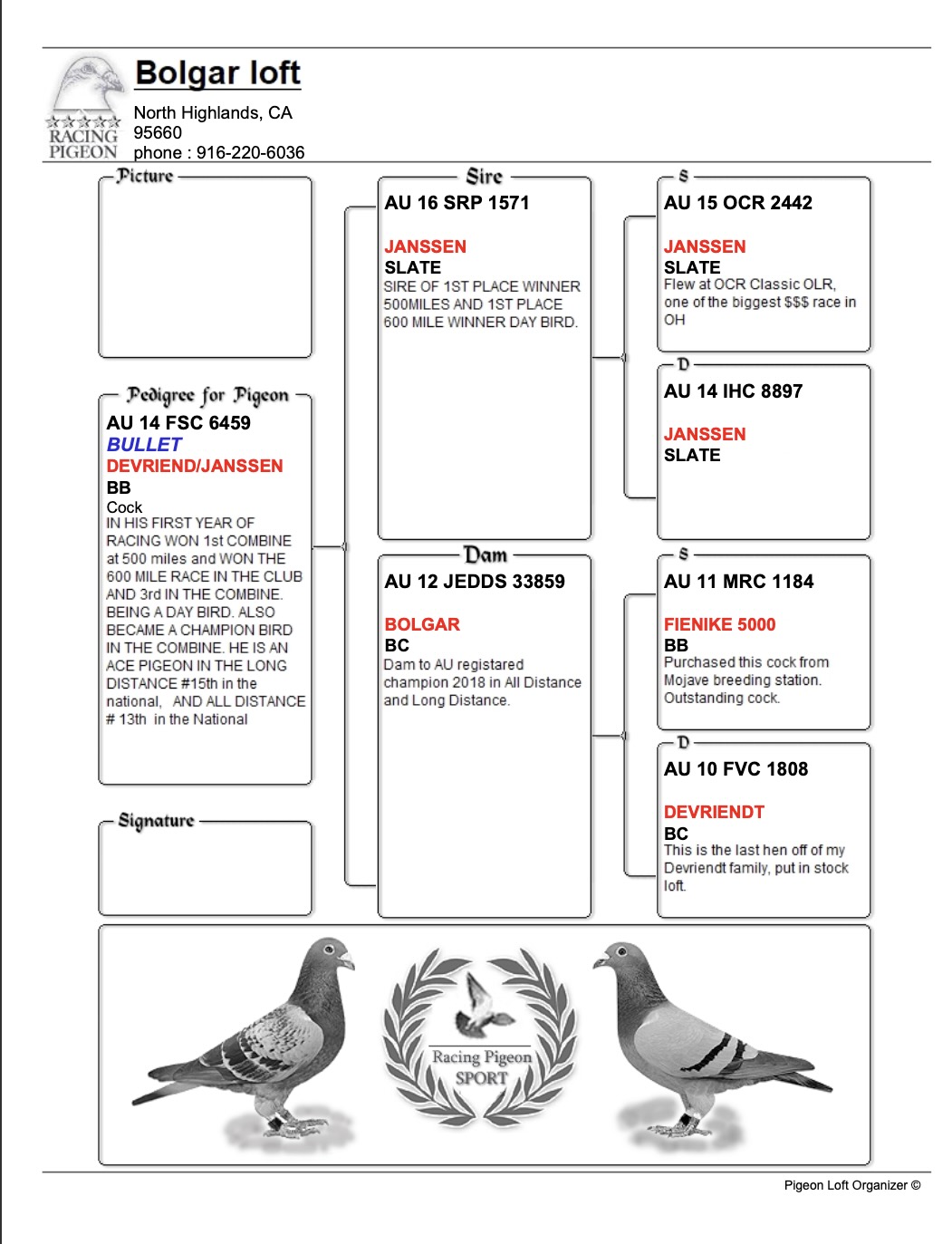 $500 SOLD. TOP QUALITY DAUGHTER OF BULLET PAIRED TO HIS OWN FULL SISTER. DEVRIENDT JANSSEN BLOODLINE