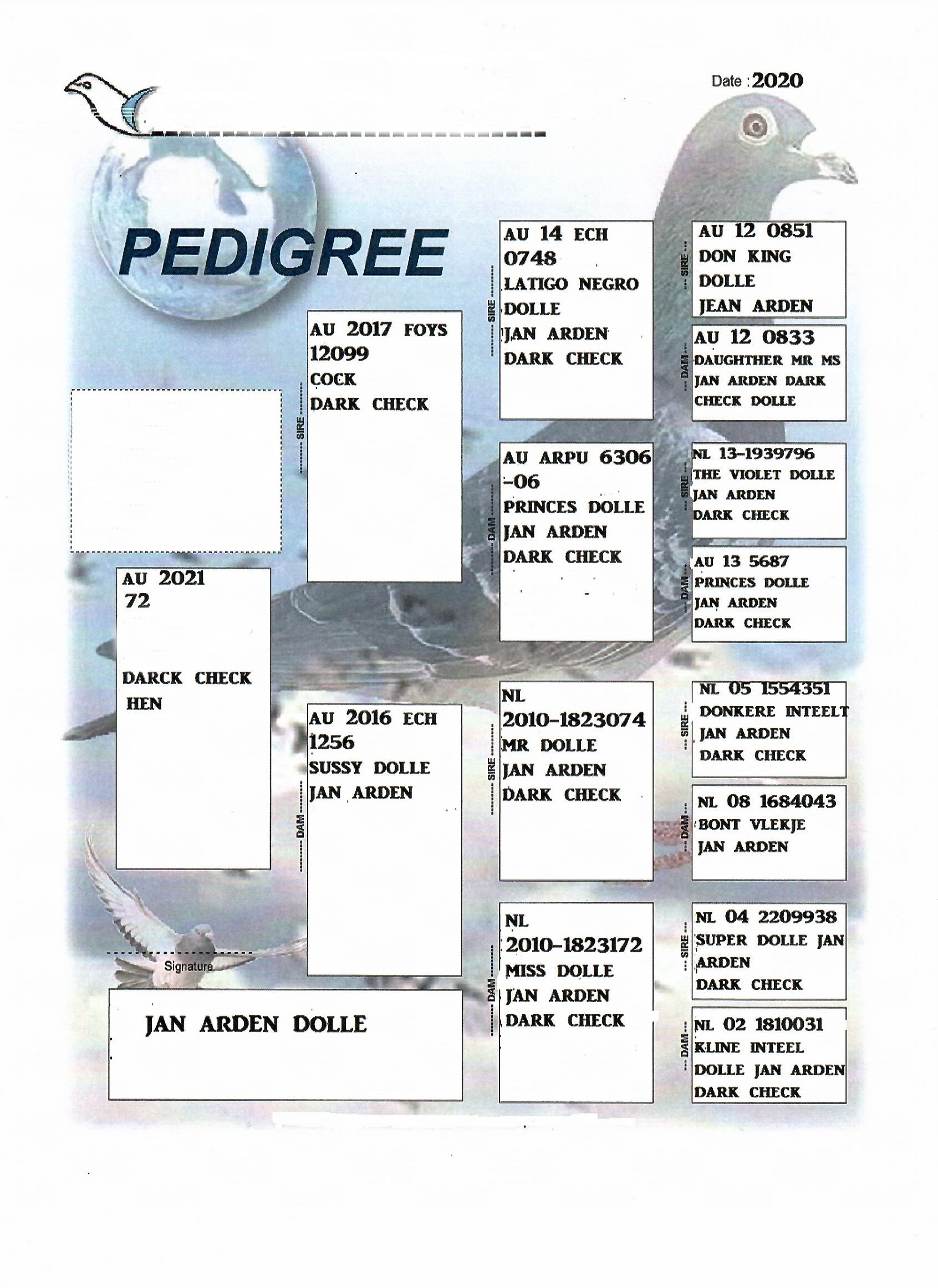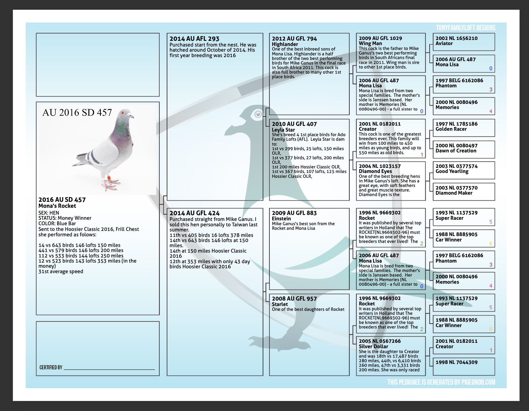 SIRE>> FLOWN FROM 100 TO 550 MILES 3 YEARS IN A ROW, HAVE WON DIPLOMAS AT DIFFIRENT DISTANCES. VERY STRONG BIRD